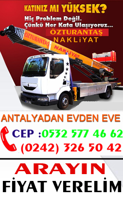 Antalya Evden Eve Nakliyeciler Çeşitli Bölgelerde Toplu Olarak Bulunmaktadırlar Bu Nakliyeciler Arasında Lider Konumda Olan Özturantaş evden eve nakliyat Uygun fiyat ve kalitesiyle öne çıkmaktadır bizlere fiyat konusunda danışmadan evinizi taşıtmayın firmamız 15 yılı aşkın evden eve nakliyat tecrübesiyle kendisine ait kapalı kasa raçları ve deneyimli elemanlarıyla hizmetinizdedir, firmamızın Evden eve asansörlü taşımacılık hizmetleri de vardır kaçıncı kata taşınırsanız taşının en yüksek katlara bile ulaşan asansörlerimizle kolay hızlı ve kaliteli taşımacılık hizmetiniz bizden alabilirsiniz.